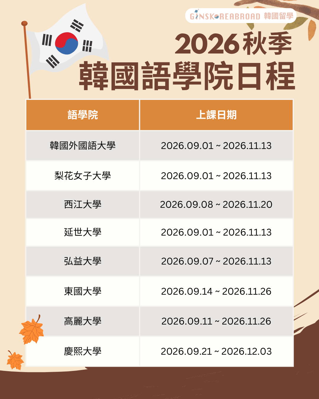 2026年9月開學的各大學語學堂陸續開始報名了!來語學堂讀韓文之餘,亦可以來韓國賞秋葉!