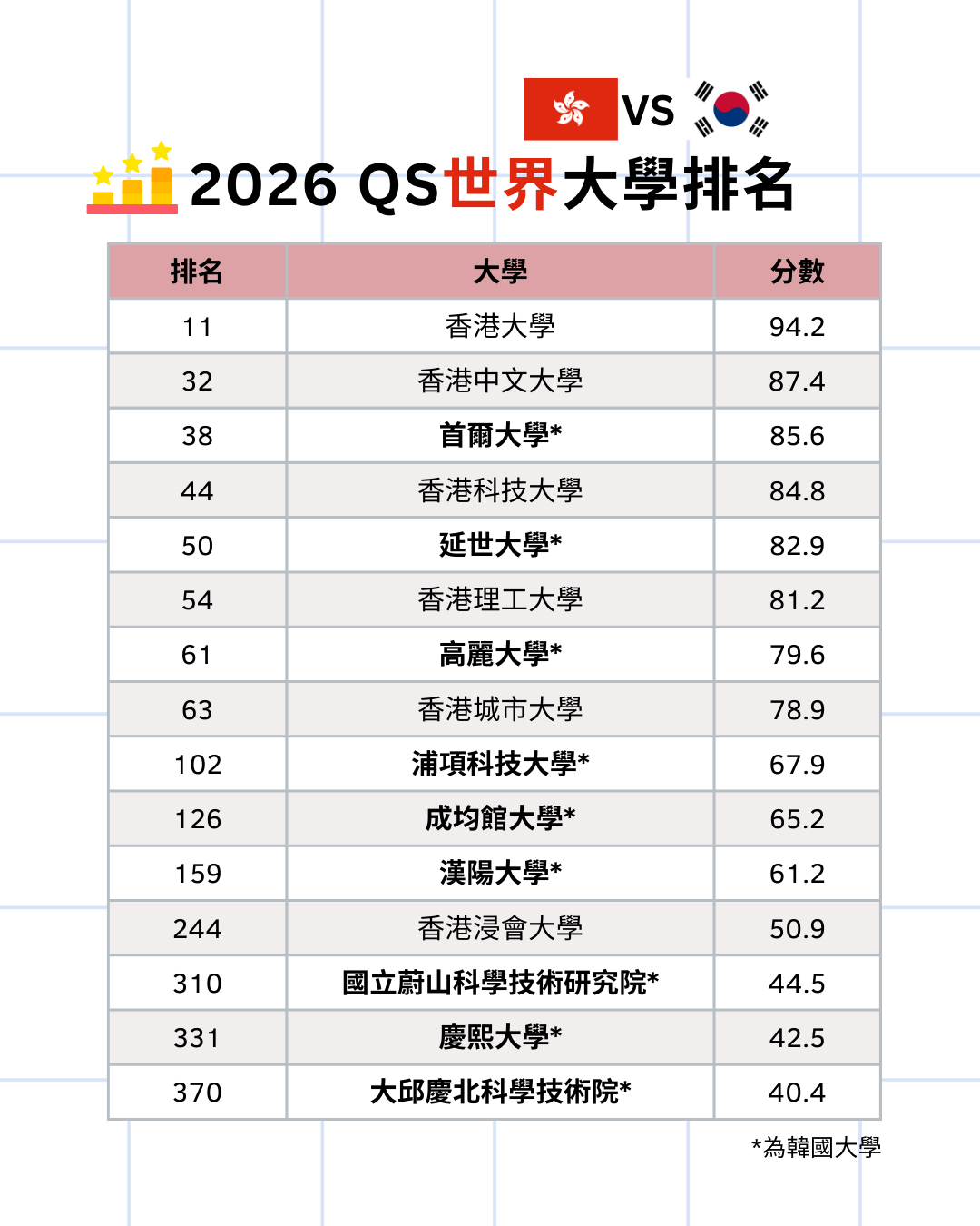 我們對比了香港和韓國大學2026年QS世界大學排名,收藏起來慢慢研究吧!