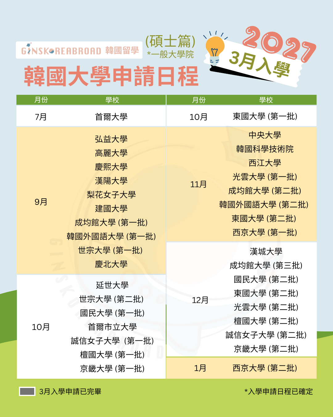 9月入學開始報名啦! 預告2027年3月韓國大學碩士(一般大學院)申請日程